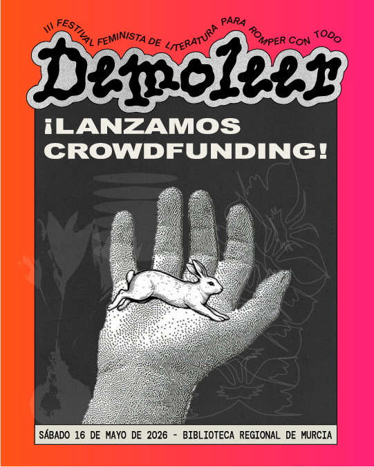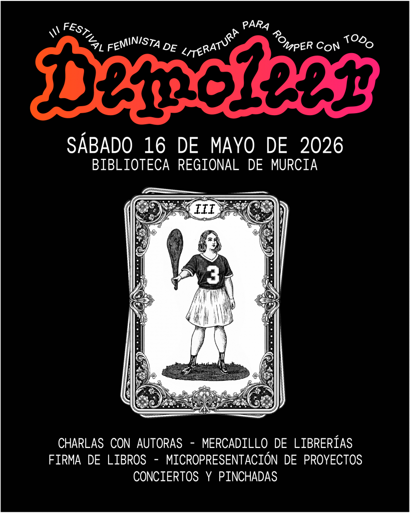 Como ya sabéis, Demoleer, el primer festival feminista de literatura de la Región de Murcia, es completamente autogestionado y autofinanciado. Tendrá lugar el próximo sábado 16 DE MAYO DE 2025 en la Biblioteca Regional de Murcia y será una jornada en la que las creadoras serán protagonistas, pero donde la participación del público será imprescindible para que nuestro mensaje, que la literatura es un gran vehículo para el activismo, llegue a todo el mundo.
